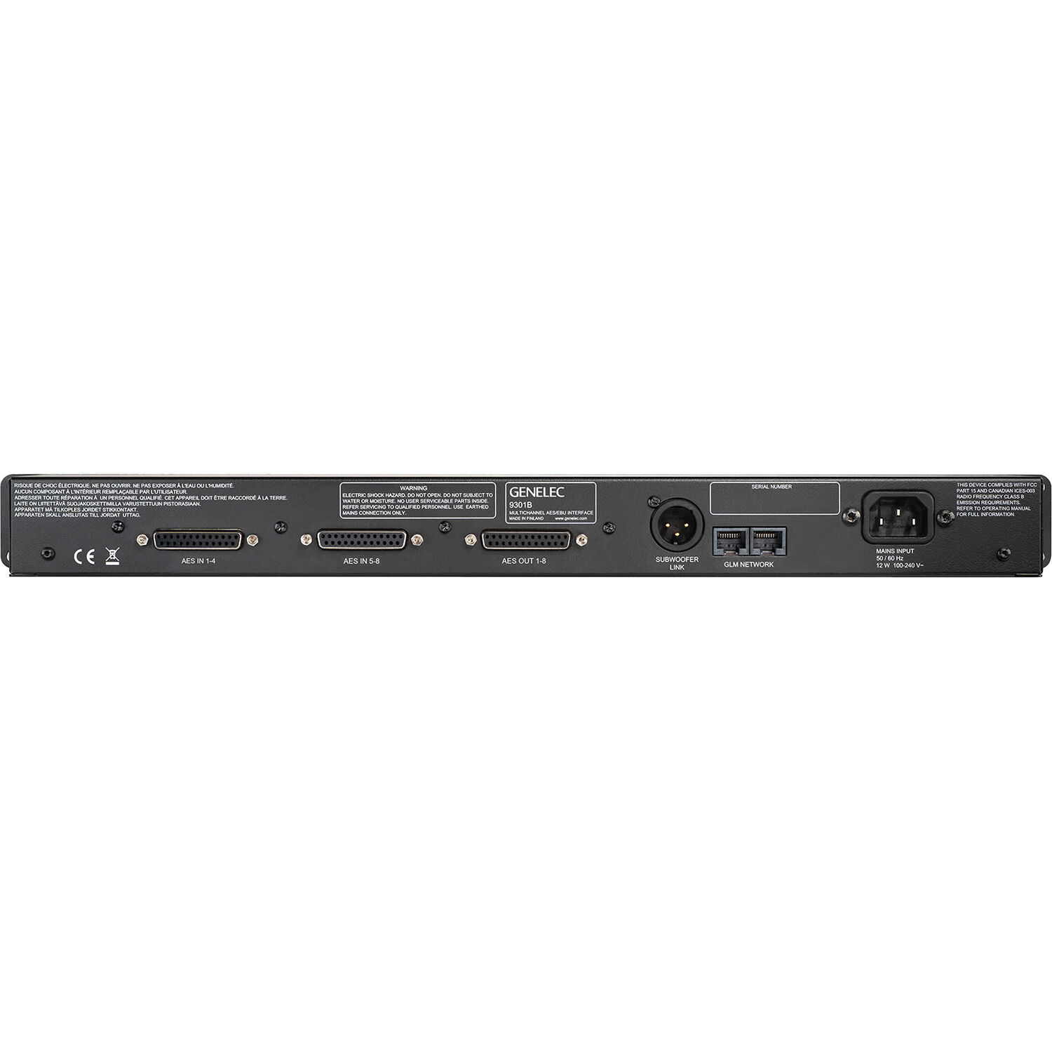 Interfaz multicanal AES/EBU Para la serie de subwoofer Genelec 7300 a través de AES/EBU Frecuencias de muestreo soportadas: 32 a 192 kHz 16 – 24 bits Conexiones: 8 x AES/EBU a 2 x DB25 en formato Tascam, 1 salida XLR AES/EBU y 2 x RJ 45 GLM-Network Formato: 19"/1U Dimensiones: 483 x 43 x 105 mm (ancho x alto x