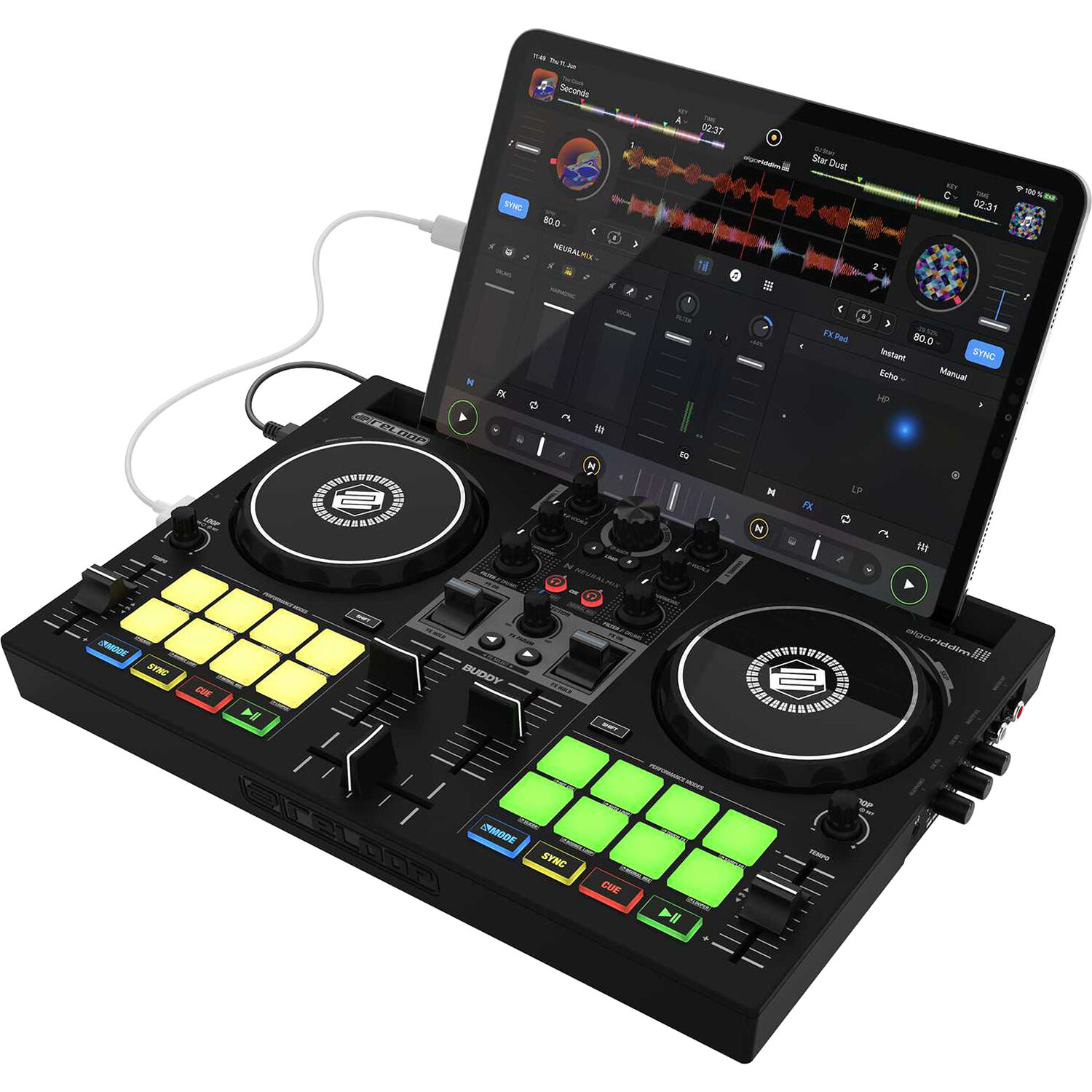 Controlador DJ de 2 canales Para iOS, iPadOS, Android, Mac y PC Plug and Play con Algoriddim Djay / Pro AI (modo clásico integrado) Compatibilidad con las plataformas Tidal, Soundcloud Go+, Beatport Link y Beatsource Link Controles Neural Mix (para separación en tiempo real de voces e instrumentos) Crossfader Fader de volumen 8 pads de interpretación RGB codificados por colores